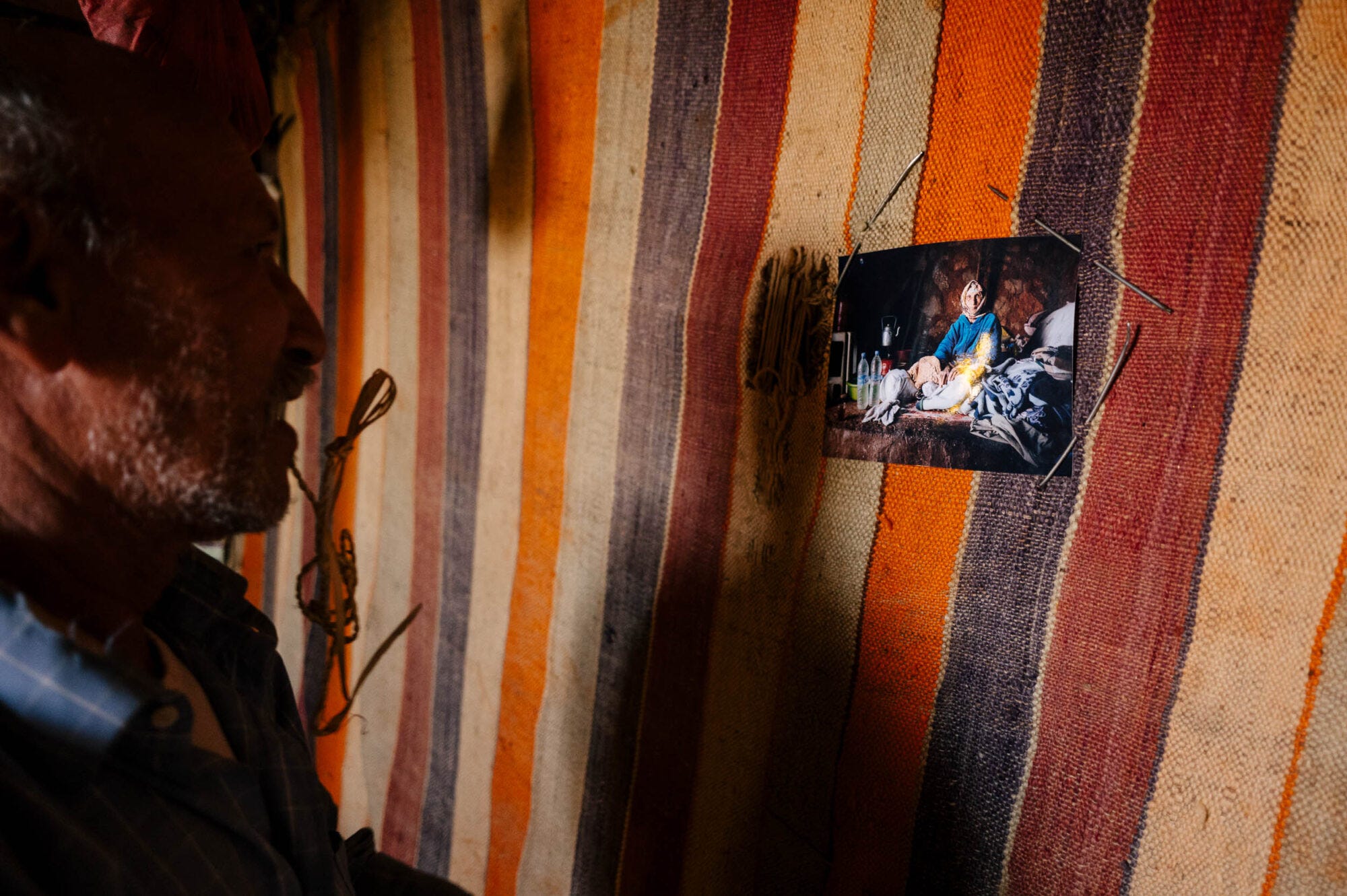 “I ride back into the mountain, and I see Mohammed. He didn’t expect to see me again, and he stops washing his dishes, towels off his hands, and he gives me a hug. I’m nervous and excited, and I flounder in my framebag and pull out the print of his mother sitting upright in her fragility, staring straight into my camera, this metal box of witness. He takes it gently, and he holds it, and he goes quiet. His deep blue eyes well up with tears, both crying and smiling while holding this moment. And I bring another photo to Fadmah, the other one, the one of her and her son holding each other, and her small, fragile body lets out a piercing shriek, and she kisses my hands, and she kisses the photo, and she kisses my hands again.”